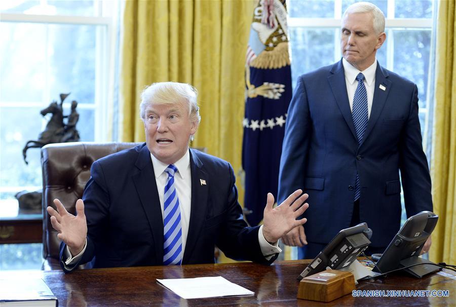 WASHINGTON D.C., marzo 24, 2017 (Xinhua) -- El presidente estadounidense, Donald Trump (i), participa junto al vicepresidente estadounidense, Mike Pence (d), durante una conferencia de prensa en la Oficina Oval de la Casa Blanca en Washington D.C., Estados Unidos de América, el 24 de marzo de 2017. Una iniciativa de salud patrocinada por el Partido Republicano fue retirada del pleno de la Cámara de Representantes antes de una votación prevista para el viernes a petición del presidente de Estados Unidos de América, Donald Trump. La decisión se tomó porque no se aseguraron suficientes votos para la aprobación del plan de salud, informaron hoy medios estadounidenses. (Xinhua/Olivier Douliery/CNP/ZUMAPRESS)