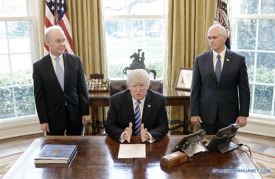 WASHINGTON D.C., marzo 24, 2017 (Xinhua) -- El presidente estadounidense, Donald Trump (c), participa junto al vicepresidente estadounidense, Mike Pence (d), y el secretario de Salud y Servicios Humanos, Tom Price (i), durante una conferencia de prensa en la Oficina Oval de la Casa Blanca en Washington D.C., Estados Unidos de América, el 24 de marzo de 2017. Una iniciativa de salud patrocinada por el Partido Republicano fue retirada del pleno de la Cámara de Representantes antes de una votación prevista para el viernes a petición del presidente de Estados Unidos de América, Donald Trump. La decisión se tomó porque no se aseguraron suficientes votos para la aprobación del plan de salud, informaron el vienes medios estadounidenses. (Xinhua/Olivier Douliery/CNP/ZUMAPRESS)
