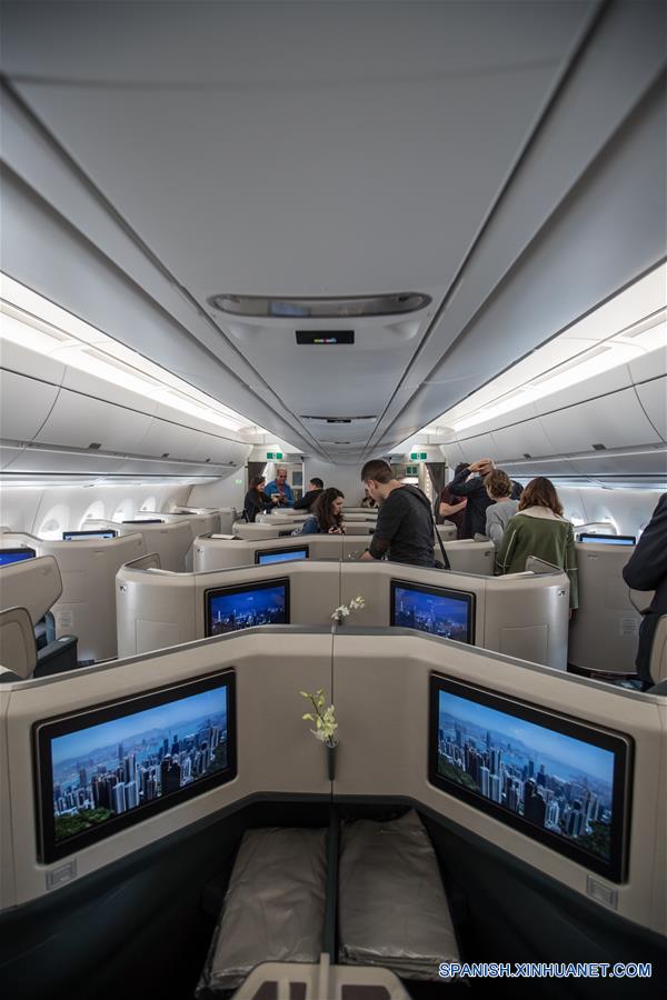 TEL AVIV, marzo 26, 2017 (Xinhua) -- Representantes de los medios de comunicación visitan la cabina de un avión de pasajeros Airbus A350-900, en el Aeropuerto Internacional Ben Gurion en Tel Aviv, Israel, el 26 de marzo de 2017. Cathay Pacific lanzó el domingo una nueva ruta de vuelo que une a Hong Kong con Tel Aviv. La aerolínea operará 4 vuelos semanales en esta ruta, con un vuelo adicional cada semana durante la temporada alta. (Xinhua/Guo Yu)