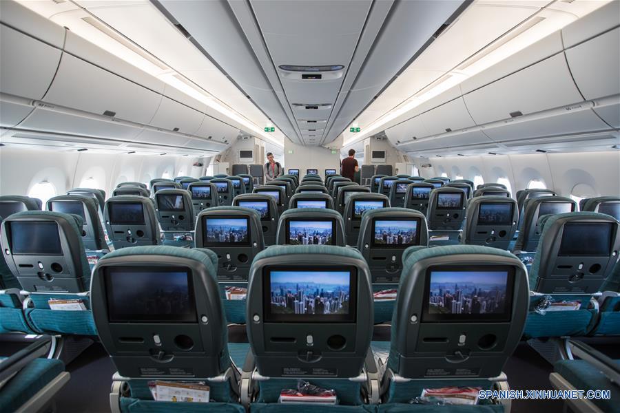 TEL AVIV, marzo 26, 2017 (Xinhua) -- Representantes de los medios de comunicación visitan la cabina de un avión de pasajeros Airbus A350-900, en el Aeropuerto Internacional Ben Gurion en Tel Aviv, Israel, el 26 de marzo de 2017. Cathay Pacific lanzó el domingo una nueva ruta de vuelo que une a Hong Kong con Tel Aviv. La aerolínea operará 4 vuelos semanales en esta ruta, con un vuelo adicional cada semana durante la temporada alta. (Xinhua/Guo Yu)