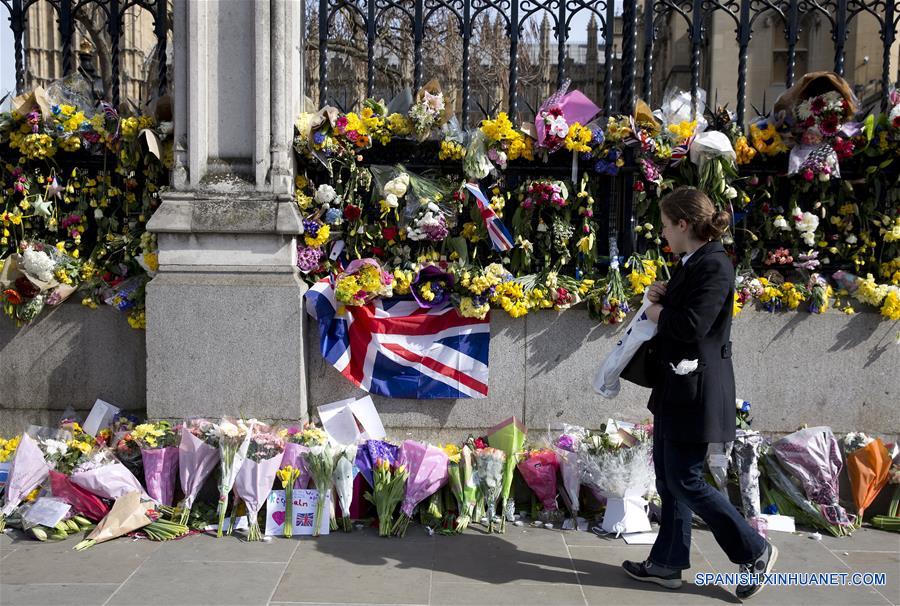 LONDRES, marzo 26, 2017 (Xinhua) -- Una mujer observa ofrendas florales para las víctimas frente al Parlamento, cuatro días después del atentado terrorista de Westminster ocurrido el 22 de marzo, en Londres, Reino Unido, el 26 de marzo de 2017. (Xinhua/Isabel Infantes/London News Pictures/ZUMAPRESS)