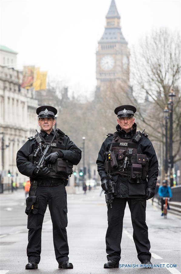 LONDRES, marzo 23, 2017 (Xinhua) -- Policías armados montan guardia en la calle Whitehall luego del atentado terrorista, en Londres, Reino Unido, el 23 de marzo de 2017. Un ciudadano chino ha resultado herido a consecuencia del ataque terrorista perpetrado el miércoles a las afueras del recinto del Parlamento británico en Londres, confirmó el jueves la embajada de China en Reino Unido. La última información publicada en el sitio web de la Embajada china recomienda a los ciudadanos chinos en este país europeo que eviten acudir a los lugares públicos concurridos o salir solos durante la noche. Según las autoridades policiales londinenses, cinco personas murieron y aproximadamente 40 sufrieron lesiones de distinta consideración, de las que siete están en estado crítico, durante el ataque terrorista del miércoles, el cual la primera ministra británica, Theresa May, tildó de "repulsivo y depravado". (Xinhua/Rob Pinney/London News Pictures/ZUMAPRESS)