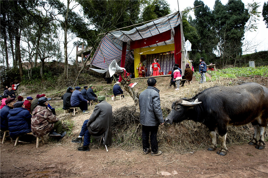 Ancianos y ni?os asisten a una actuación de una compa?ía de ópera rural en Tangshou, municipio de Chuangshan, provincia de Sichuan. Foto del 9 de marzo de 2014. [Foto de Liu Li / photoint.net]