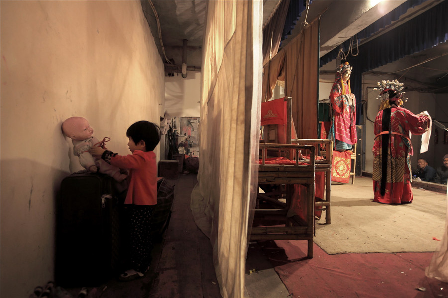 Zeng Yueyue, de cuatro a?os, vive con sus abuelos, que trabajan en una compa?ía de ópera. Mientras sus abuelos actúan sobre el escenario, Zeng juega con su mu?eca detrás del escenario. Foto del 8 de abril de 2014. [Foto de Liu Li / photoint.net]