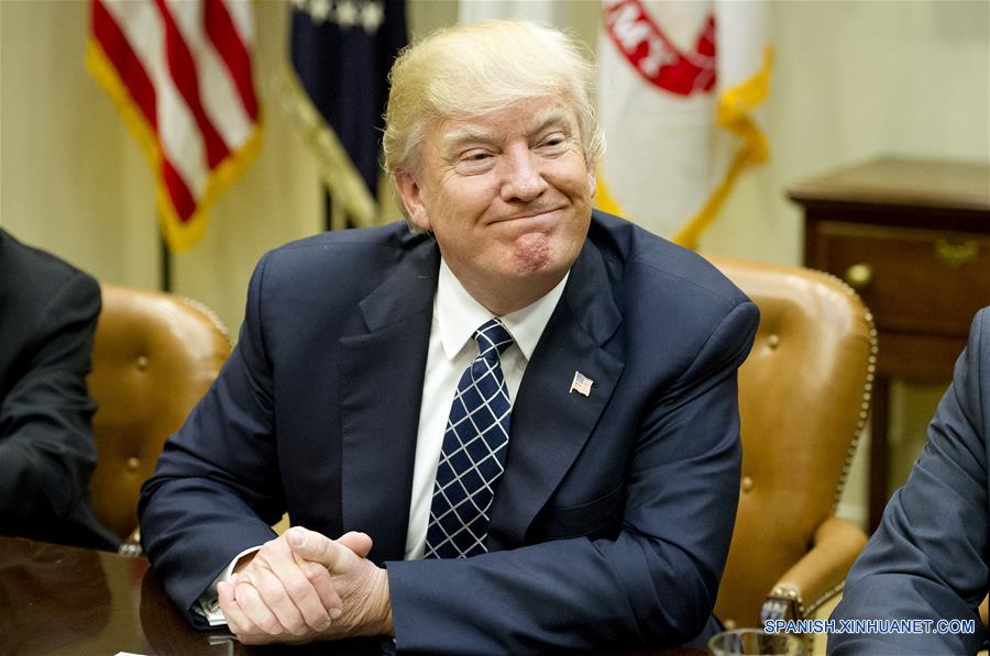 WASHINGTON, D.C., marzo 28, 2017 (Xinhua) -- El presidente de Estados Unidos de América, Donald Trump, reacciona durante una sesión de escucha con la Orden Fraternal de la Policía, en el salón Roosevelt de la Casa Blanca, en Washington, D.C., capital de Estados Unidos de América, el 28 de marzo de 2017. El presidente de Estados Unidos, Donald Trump, firmó el martes una orden ejecutiva que busca revertir las políticas climáticas de su predecesor Barack Obama. Trump, quien describió el cambio climático como un "enga?o", firmó la Orden Ejecutiva de Independencia Energética durante su primera visita a la Agencia de Protección Ambiental (EPA) de Estados Unidos de América. (Xinhua/Ron Sachs/CNP/ZUMAPRESS)