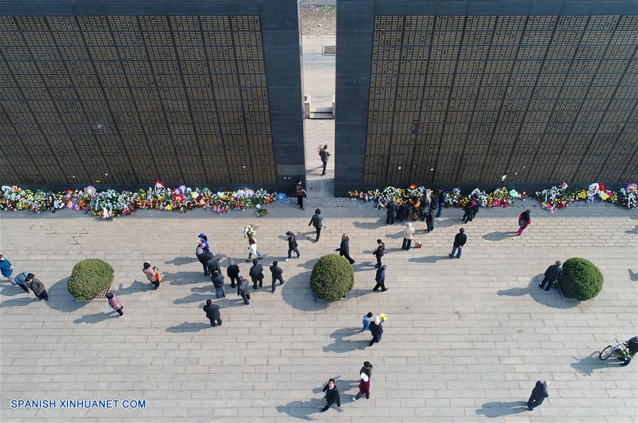 HEBEI, abril 3, 2017 (Xinhua) -- Personas lloran a sus difuntos por el terremoto de Tangshan de 1976, frente a un muro memorial en Tangshan, la provincia de Hebei, en el norte de China, el 3 de abril de 2017. El Día de Limpieza de Tumbas, o Qingming, se celebra al inicio de abril, cuando las personas conmemoran a sus muertos visitando sus tumbas. (Xinhua/Mu Yu)