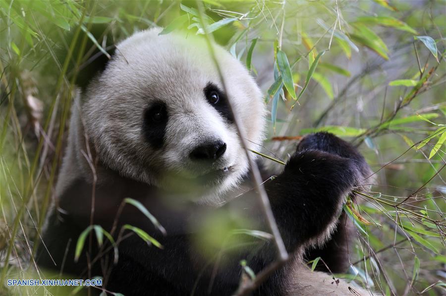 SHAANXI, abril 3, 2017 (Xinhua) -- Imagen del 1 de abril de 2017, de un panda gigante salvaje comiendo bambú en las Monta?as Qinling en la provincia de Shaanxi, en el noroeste de China. (Xinhua/Pu Chunju)