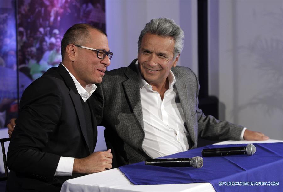 QUITO, abril 4, 2017 (Xinhua) -- El candidato a la presidencia de Ecuador por el oficialista movimiento Alianza País, Lenín Moreno (d), reacciona luego de conocer los datos oficiales del Consejo Nacional Electoral (CNE) sobre la segunda vuelta de las elecciones presidenciales, junto al candidato a la vicepresidencia, Jorge Glas (i), en la Casa de Campa?a en Quito, capital de Ecuador, el 4 de abril de 2017. El candidato presidencial oficialista, Lenín Moreno, es el nuevo presidente de Ecuador tras ganar con el 51.16 por ciento de los votos válidos en la segunda vuelta de las elecciones presidenciales celebradas el domingo, informó el martes el Consejo Nacional Electoral (CNE). (Xinhua/Santiago Armas)