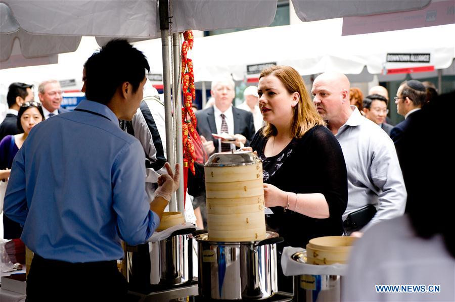 Los estadounidenses prueban los tradicionales bollos al vapor chinos durante un festival gastronómico organizado por el Grupo Fosun China en la plaza del Edificio Fosun China en Nueva York, Estados Unidos, el 30 de septiembre de 2014. [Foto / Xinhua]