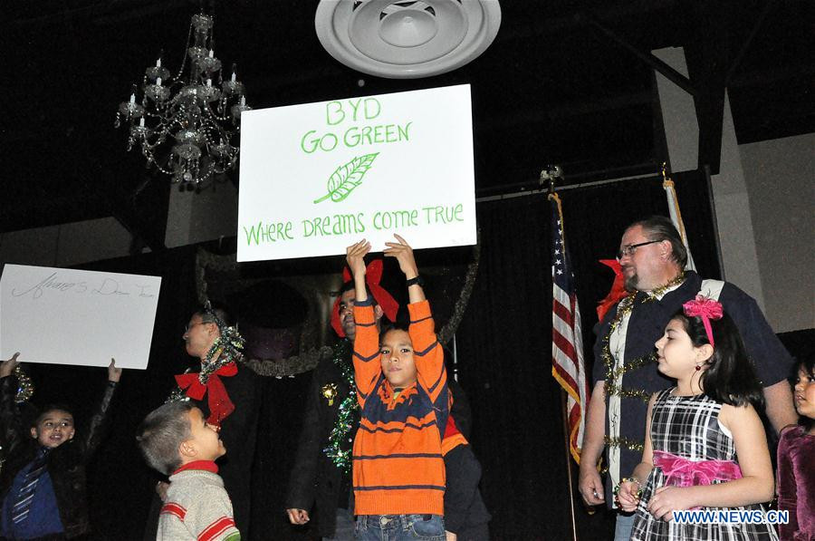 Los trabajadores de la empresa BYD y sus familiares organizan una fiesta de Navidad en la fábrica de la marca automovilística china en Lancaster, California, Estados Unidos, el 9 de diciembre de 2016. Además de las contribuciones a la economía local y oportunidades de empleo, las empresas chinas han hecho esfuerzos continuos en proyectos de educación, eventos benéficos y obras comunitarias en Estados Unidos en los últimos a?os. [Foto / Xinhua]