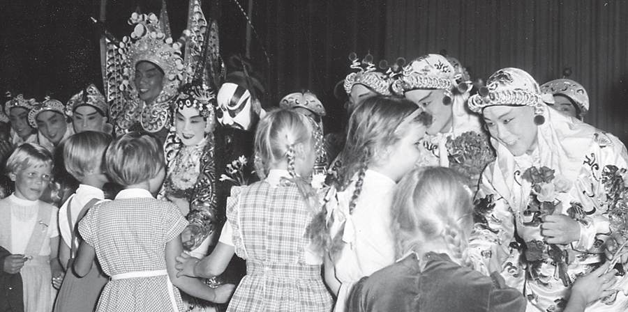 Los artistas de una compa?ía china de ópera de Pekín reciben flores de los ni?os fineses durante su primera visita a Finlandia en 1955, gracias a la coordinación de la Asociación de Amistad Sino-Finesa. (Fotos: cortesía de la Asociación de Amistad Sino-Finesa)