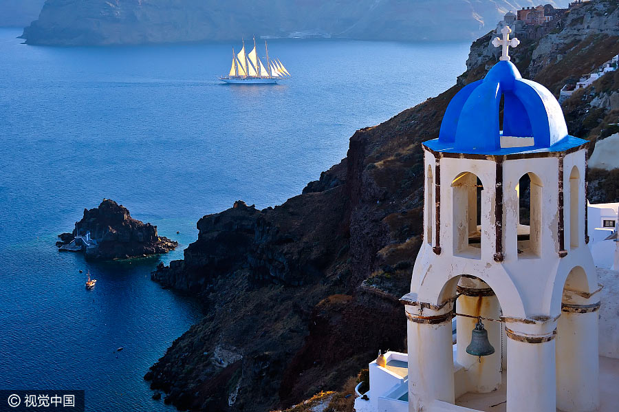 Santorini en Grecia es una visita obligada en las listas de viajes de muchas personas. Las vistas al mar se mezclan con la arquitectura blanca resaltada con techos azules, donde los visitantes pueden encontrar paz y tranquilidad a través de su belleza. [Foto / VCG]