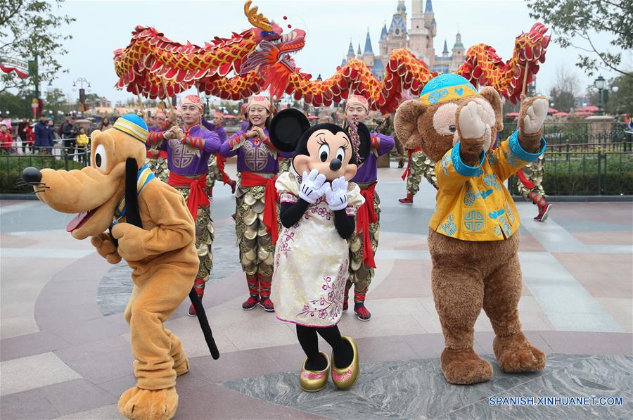 Personajes de dibujos animan durante la dranza tradicional china del dragón en el Shanghai Disney Resort, en Shanghai, en el este de China, el 11 de enero de 2017. (Xinhua/Ding Ting)