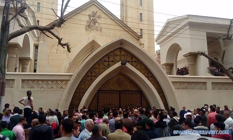 Personas se reúnen en el sitio donde se registró una explosión en Tanta, Egipto, el 9 de abril de 2017. Al menos 21 personas murieron y otras 59 resultaron heridas a causa de la explosión ocurrida el domingo en una iglesia copta localizada en la ciudad egipcia de Tanta, en el delta del Nilo, informó el Ministerio de Salud del país. (Xinhua/Ahmed Gomaa)