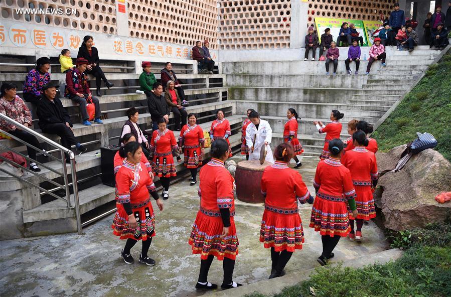 Los aldeanos realizan danza folclórica en el área pública del Hospital de Angdong, municipio Baojing, provincia de Hunan. Este nuevo hospital rural, inaugurado en 2014, ha sido reconocido con el Premio Internacional de Arquitectura Emergente, alto honor que otorga el Real Instituto de Arquitectos Británicos. (Foto: Li Ga)