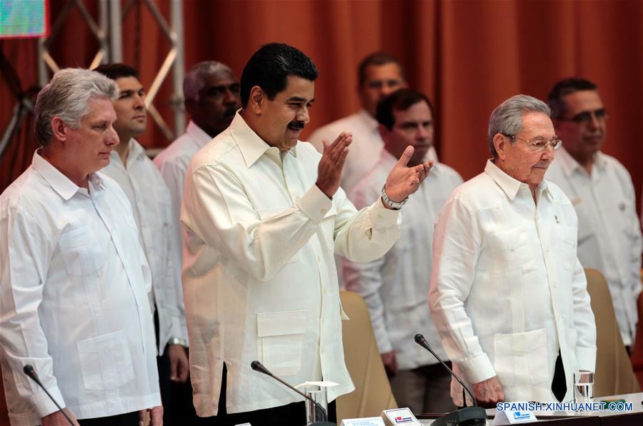 LA HABANA, abril 10, 2017 (Xinhua) -- Imagen cedida por Presidencia de Venezuela, del presidente cubano, Raúl Castro (d-frente), y su homólogo venezolano, Nicolás Maduro (c-frente), participando durante un acto en solidaridad con Venezuela en el marco del XV Consejo Político de la Alianza Bolivariana para los Pueblos de Nuestra América-Tratado de Comercio de los Pueblos (ALBA-TCP) en La Habana, Cuba, el 10 de abril de 2017. La Alianza Bolivariana para los Pueblos de Nuestra América-Tratado de Comercio de los Pueblos (Alba-TCP) aprobó el lunes una declaración de apoyo a Venezuela frente a la actitud "proimperialista" del secretario general de la Organización de Estados Americanos (OEA), Luis Almagro. (Xinhua/Presidencia de Venezuela)