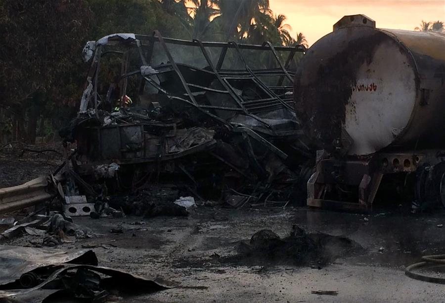 GUERRERO, abril 13, 2017 (Xinhua) -- Escombros permanecen en el lugar donde se registró una colisión entre un autobús turístico y un camión cisterna, a la altura del kilómetro 300 de la autopista Siglo XXI, perteneciente a la localidad de Petacalco, en el estado de Guerrero, México, el 13 de abril de 2017. El saldo de la explosión de un camión pipa de combustible tras chocar con un autobús de pasajeros en una autopista en los límites de los estados de Guerrero y Michoacán, en el suroeste de México, aumentó el jueves a 24 muertos y 9 heridos, de acuerdo con las autoridades. (Xinhua/Str)