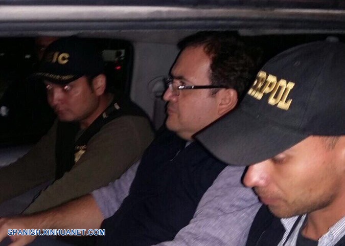 CIUDAD DE GUATEMALA, abril 15, 2017 (Xinhua) -- Imagen cedida por la Policía Nacional Civil de Guatemala tomada con un dispositivo móvil, del exgobernador del estado de Veracruz, Javier Duarte de Ochoa (c), siendo tralsadado luego de su detención en el municipio de Panajachel, en el departamento de Sololá, Guatemala, el 15 de abril de 2017. De acuerdo con información de la prensa local, la Procuraduría General de la República (PGR) informó el sábado en su cuenta de Twitter que Javier Duarte de Ochoa, exgobernador del estado de Veracruz, fue capturado con apoyo de la República de Guatemala. Duarte es acusado de delincuencia organizada, desvío de recursos públicos y manejo de recursos de procedencia ilícita. (Xinhua/Policía Nacional Civil de Guatemala)