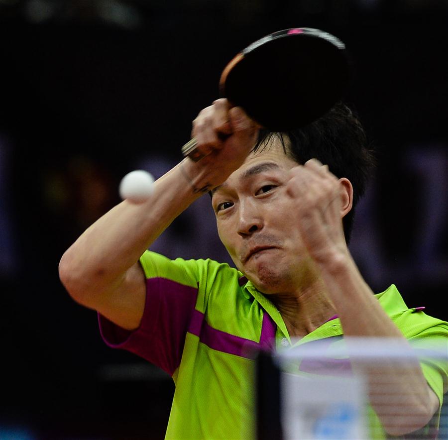Jeong Sangeun devuelve la pelota a Fan Zhendong durante un partido de la categoría individual masculina en los XXIII Campeonatos Asiáticos de Tenis de Mesa en Wuxi, provincia de Jiangsu, el 16 de abril de 2017. Jeong perdió 0-3 quedando en segundo lugar en la competición. (Xinhua / Li Xiang)