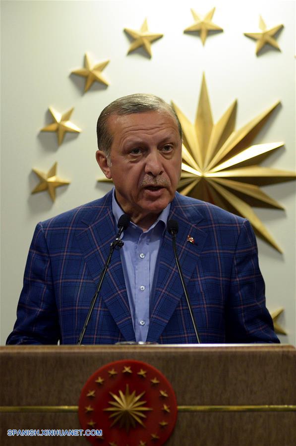 ESTAMBUL, abril 16, 2017 (Xinhua) -- El presidente turco, Recep Tayyip Erdogan, pronuncia un discurso en Estambul, Turquía, el 16 de abril de 2017. El presidente de Turquía, Recep Tayyip Erdogan, declaró durante la noche del domingo que las enmiendas constitucionales propuestas fueron aceptadas en un referendo, lo que abre paso a la adopción del sistema presidencialista en el país. (Xinhua/DHA/Depo Photos)