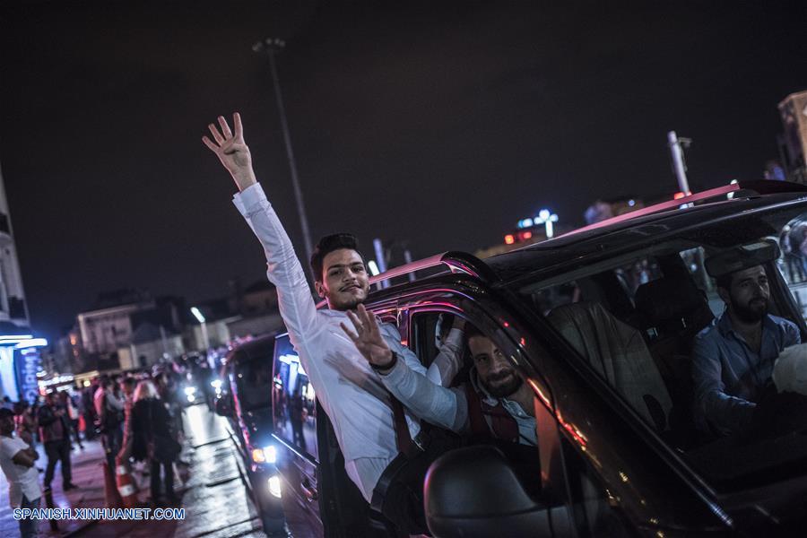 ESTAMBUL, abril 16, 2017 (Xinhua) -- Simpatizantes del gobernante Partido de la Justicia y el Desarrollo (AK) celebran la victoria del "Sí" en el referendo cerca de la Plaza Taksim en Estambul, Turquía, el 16 de abril de 2017. El primer ministro turco, Binali Yildirim, declaró durante la noche del domingo la victoria para el "Sí" en el referendo sobre las enmiendas constitucionales para abandonar el sistema parlamentario y adoptar un sistema presidencial en el país. (Xinhua/Depo Photos/ZUMAPRESS)