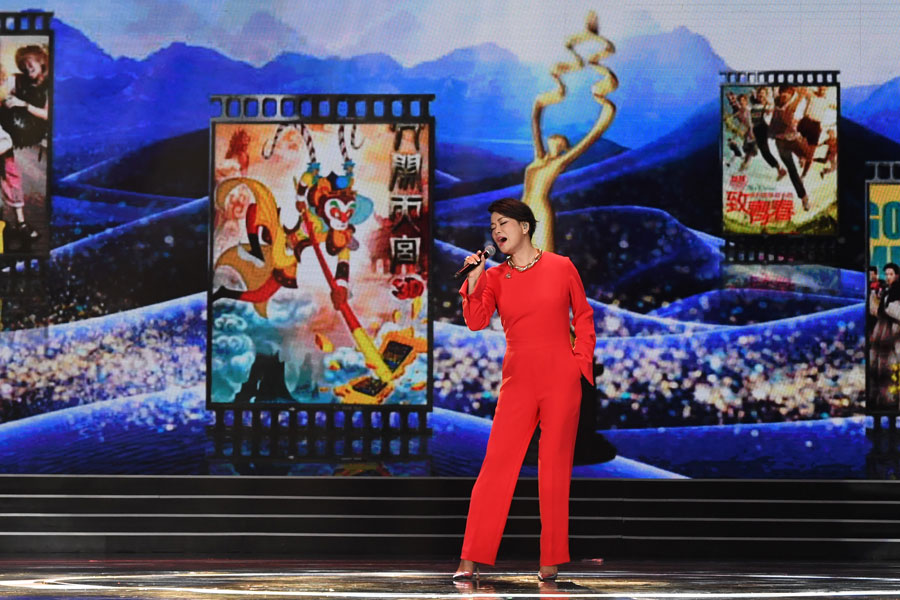 La cantante Mao Amin canta durante la ceremonia de apertura del Festival Internacional de Cine de Beijing el domingo. El evento durará hasta el 23 de abril de 2017. [Foto por Jiang Dong / China Daily]