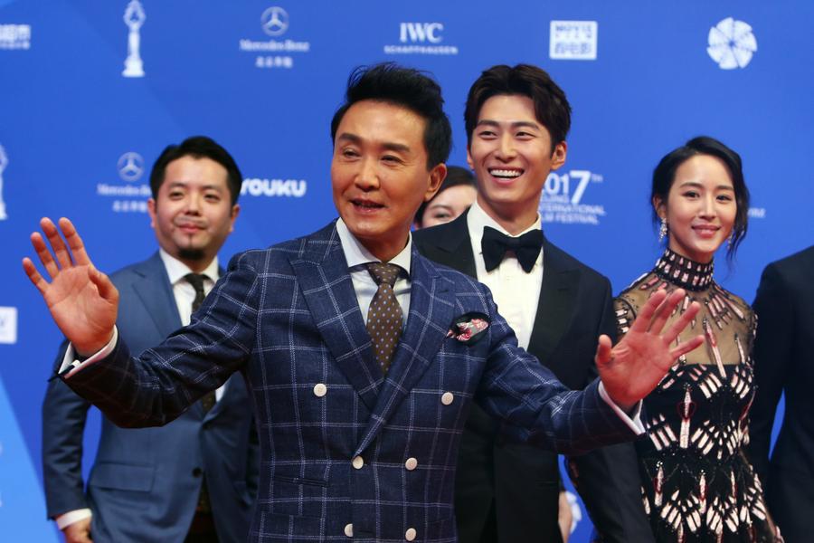 Miembros del reparto de Youth Dinner posan en la alfombra roja durante la apertura del Festival Internacional de Cine de Beijing el domingo. El evento durará hasta el 23 de abril de 2017. [Foto por Jiang Dong / China Daily]