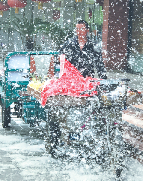 Cientos de pelusas cubren el carro de un vendedor de fruta en el distrito Chaoyang, en Beijing. [Foto: Xu Jingxing]
