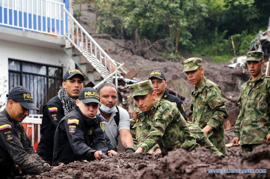 MANIZALES, abril 19, 2017 (Xinhua) -- Soldados y policías trabajan en el lugar donde se registró un alud de tierra, en un barrio de la ciudad de Manizales, Colombia, el 19 de abril de 2017. Al menos 11 personas murieron y otras 20 permanecen desaparecidas por una alud de tierra que destruyó varias viviendas en un barrio de la ciudad colombiana de Manizales, en el centro-oeste del país, donde se desplazará el presidente Juan Manuel Santos. (Xinhua/COLPRENSA)