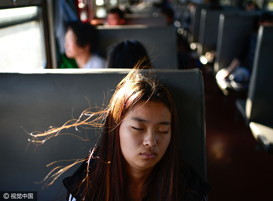 Una mujer duerme un rato en el tren, el 14 de abril de 2017.