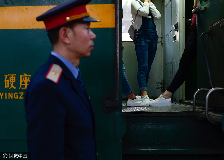 Tres mujeres fotografían sus zapatos blancos durante una parada, el 14 de abril de 2017.