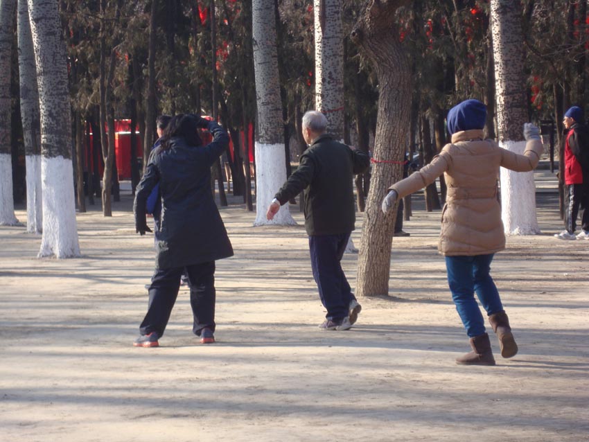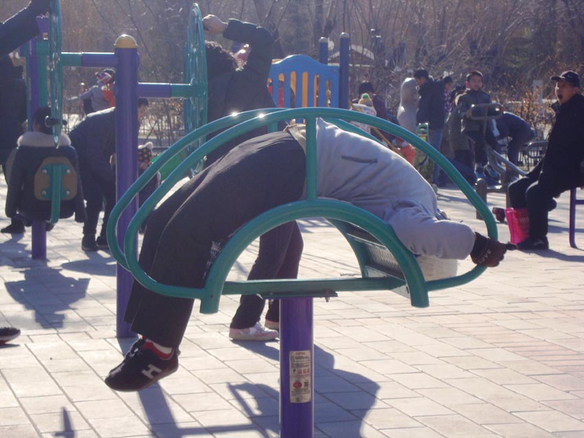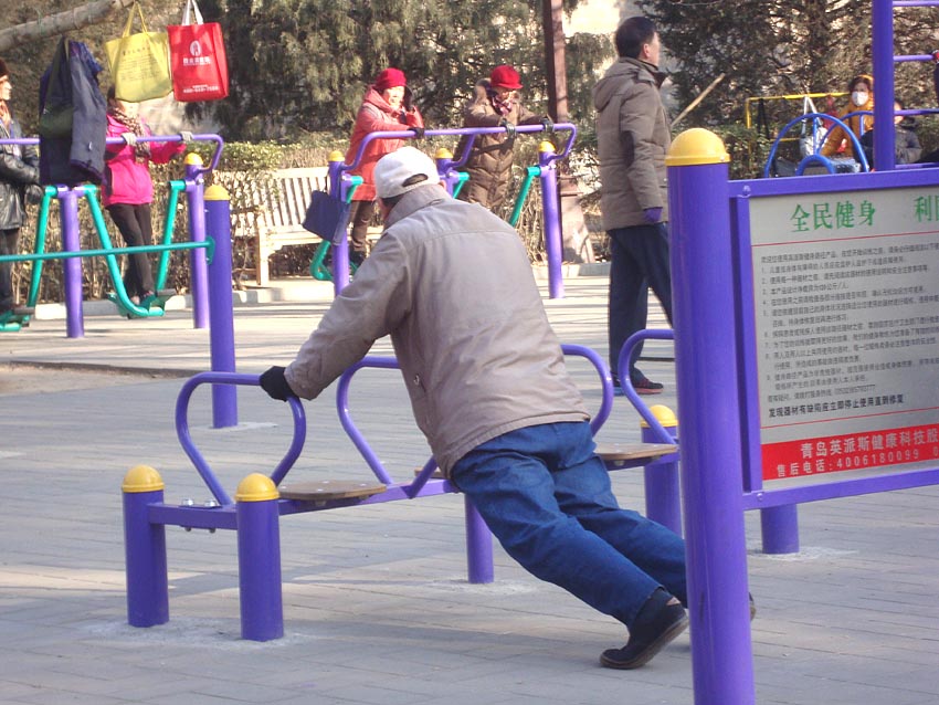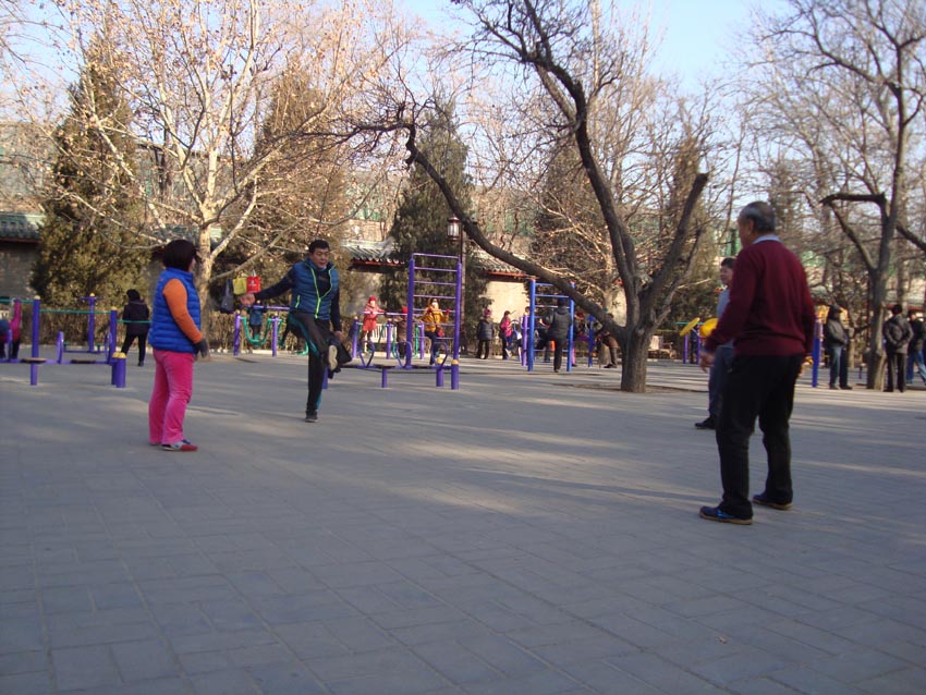 Es muy común ver a chinos haciendo ejercicio, estiramientos o bailando en las calles de Beijing. Esto es especialmente cierto de la gente mayor. Es fácil encontrarlos en parques y en zonas equipadas para hacer ejercicio, pero en China, cualquier peque?a esquina vale. Este es uno de los aspectos que más me asombró cuando llegué a China, y continúa sorprendiéndome. No creo que haya otro lugar en el mundo que sobrepase el interés que los chinos tienen por la longevidad y por mantenerse en forma en la vejez.