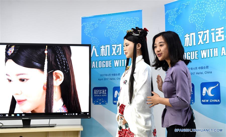 HEFEI, abril 24, 2017 (Xinhua) -- Jia Jia, una robot interactiva que parece una joven china real en ropa tradicional, conversa a través de internet con Kevin Kelly, fundador y editor ejecutivo de la revista Wired, en Hefei, capital de la provincia de Anhui, en el este de China, el 24 de abril de 2017. Jia Jia fue invitada como una reportera especial de la Agencia de Noticias Xinhua para conducir el diálogo hombre-máquina con Kelly el lunes. Jia Jia fue presentada en 2016 por un equipo de investigación y desarrollo robótico en la Universidad de Ciencia y Tecnología de China en Hefei. Le tomó al equipo tres a?os investigar y desarrollar este robot interactivo de nueva generación, que puede hablar, mostrar microexpresiones, mover sus labios y mover su cuerpo. (Xinhua/Guo Chen)