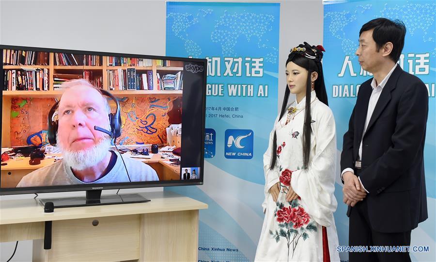 HEFEI, abril 24, 2017 (Xinhua) -- Chen Xiaoping (d), director de un equipo de investigación y desarrollo robótico, y Jia Jia (c), una robot interactiva que parece una joven china real en ropa tradicional, conversan a través de internet con Kevin Kelly, fundador y editor ejecutivo de la revista Wired, en Hefei, capital de la provincia de Anhui, en el este de China, el 24 de abril de 2017. Jia Jia fue invitada como una reportera especial de la Agencia de Noticias Xinhua para conducir el diálogo hombre-máquina con Kelly el lunes. Jia Jia fue presentada en 2016 por un equipo de investigación y desarrollo robótico en la Universidad de Ciencia y Tecnología de China en Hefei. Le tomó al equipo tres a?os investigar y desarrollar este robot interactivo de nueva generación, que puede hablar, mostrar microexpresiones, mover sus labios y mover su cuerpo. (Xinhua/Guo Chen)