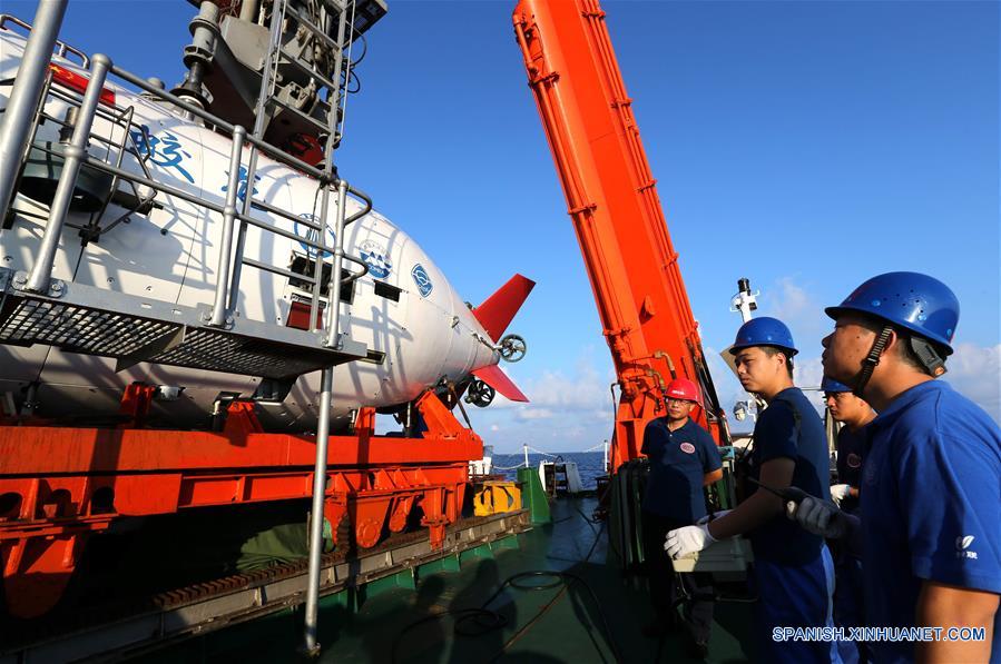 A BORDO DEL XIANGYANGHONG 09, abril 26, 2017 (Xinhua) -- El sumergible tripulado Jiaolong de China es preparado para su primera inmersión de este a?o en el Mar Meridional de China, en el sur de China, el 26 de abril de 2017. Un equipo científico chino se embarcó el martes en una misión de aguas profundas en el Mar Meridional de China, dando comienzo a la segunda fase de la 38 expedición oceánica de China. (Xinhua/Liu Shiping)