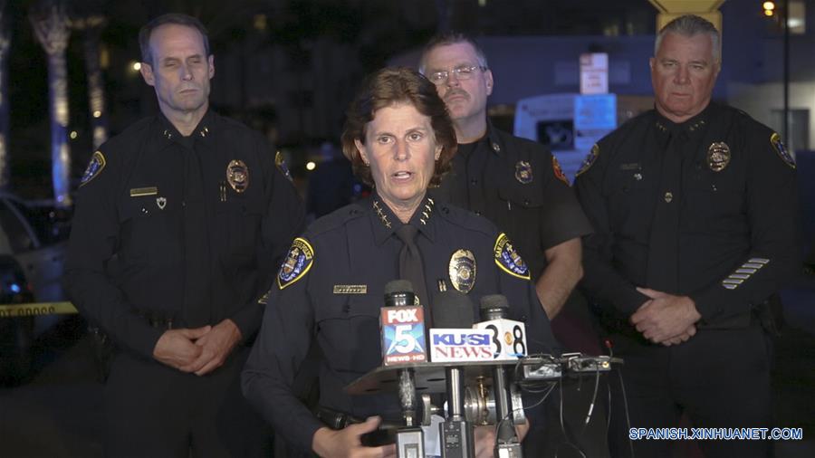 SAN DIEGO, mayo 1, 2017 (Xinhua) -- La jefa de la policía de San Diego, Shelley Zimmerman (c) participa durante una conferencia de prensa en el área donde se registró un tiroteo, en San Diego, Estados Unidos de América, el 30 de abril de 2017. Al menos ocho personas resultaron heridas el domingo en un tiroteo iniciado por un hombre que bebía cervezas en una piscina de la ciudad estadounidense de San Diego, informó el canal de televisión KFMB-TV. (Xinhua/Nelvin C. Cepeda/San Diego Union-Tribune/ZUMAPRESS)