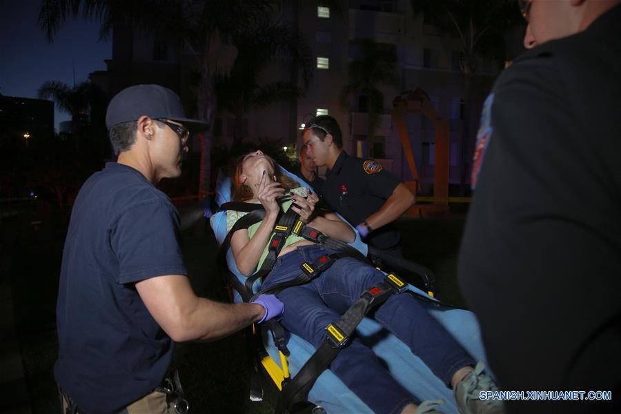 SAN DIEGO, mayo 1, 2017 (Xinhua) -- Una mujer herida es trasladada a una ambulancia cerca del área donde se registró un tiroteo, en San Diego, Estados Unidos de América, el 30 de abril de 2017. Al menos ocho personas resultaron heridas el domingo en un tiroteo iniciado por un hombre que bebía cervezas en una piscina de la ciudad estadounidense de San Diego, informó el canal de televisión KFMB-TV. (Xinhua/Nelvin C. Cepeda/TNS/ZUMAPRESS)