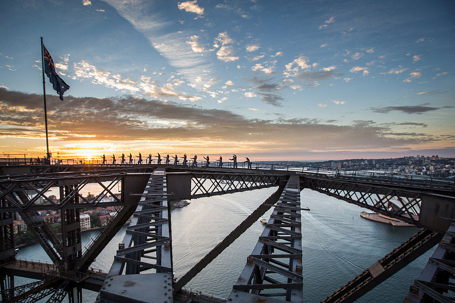 El sol sale junto al puente. El Sydney Harbour Bridge y la Academia Australiana de Tai Chi y Qigong han organizado la primera clase de Tai Chi en la ciudad más grande de Australia, el 2 de mayo de 2017. [Foto / VCG]