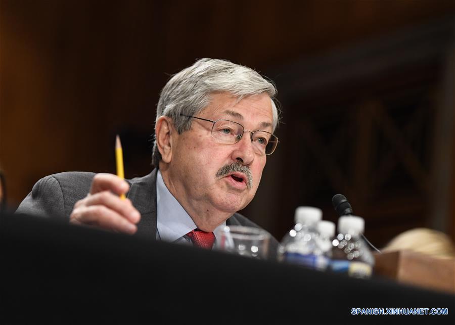 WASHINGTON, mayo 2, 2017 (Xinhua) -- El gobernador de Iowa, Terry Branstad, testifica ante el Comité de Relaciones Internacionales del Senado estadounidense durante su audiencia de confirmación para ser el embajador de Estados Unidos en China, en Capitol Hill, Washington D.C., Estados Unidos, el 2 de mayo de 2017. El nominado por el presidente de Estados Unidos Donald Trump para el cargo de embajador en China, Terry Branstad, dijo el martes que, en caso de ser confirmado, trabajará para "influir positivamente" en la relación entre ambos países. (Xinhua/Bo Dandan)
