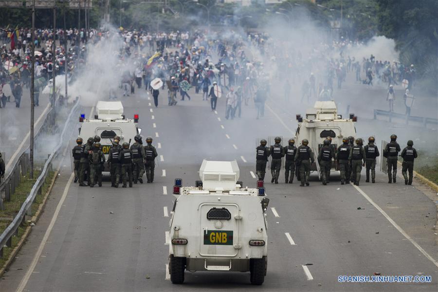 CARACAS, mayo 3, 2017 (Xinhua) -- Elementos de las fuerzas de seguridad reaccionan durante un enfrentamiento en una protesta en la autopista Francisco Fajardo, en Caracas, Venezuela, el 3 de mayo de 2017. De acuerdo con información de la prensa local, la protesta que tenía como destino la Asamblea Nacional (AN) de Venezuela, se llevó a cabo en contra de la convocatoria a una Asamblea Nacional Constituyente del presidente Nicolás Maduro. (Xinhua/Francisco Bruzco)