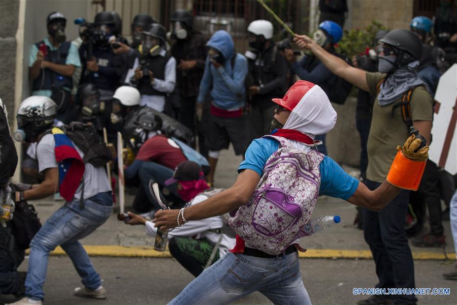 CARACAS, mayo 3, 2017 (Xinhua) -- Manifestantes participan durante un enfrentamiento con elementos de las fuerzas de seguridad en una protesta en la autopista Francisco Fajardo, en Caracas, Venezuela, el 3 de mayo de 2017. De acuerdo con información de la prensa local, la protesta que tenía como destino la Asamblea Nacional (AN) de Venezuela, se llevó a cabo en contra de la convocatoria a una Asamblea Nacional Constituyente del presidente Nicolás Maduro. (Xinhua/Francisco Bruzco)