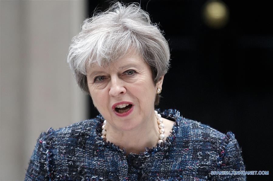 LONDRES, mayo 3, 2017 (Xinhua) -- La primera ministra de Reino Unido, Theresa May, realiza una declaración en el número 10 de la calle Downing, luego de su reunión con la reina Isabel II de Reino Unido, en Londres, Reino Unido, el 3 de mayo de 2017. El Parlamento británico fue oficialmente disuelto el miércoles ante la celebración de elecciones anticipadas el 8 de junio de 2017. May visitó a la reina Isabel II el miércoles por la tarde para comunicarle la disolución. (Xinhua/Tim Ireland)