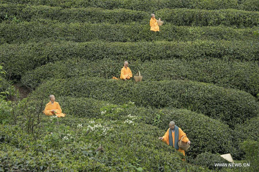 Monjas del Templo Tiantai recogen hojas de té después de la ceremonia que marca el inicio de la recolección de té en la monta?a Tiantai del condado Hong'an, provincia de Hubei, el 3 de mayo de 2017. El Templo Tiantai posee un enorme jardín de té. Los monjes de este lugar son expertos en la siembra, colecta y preparación de té. (Xinhua / Du Huanju)