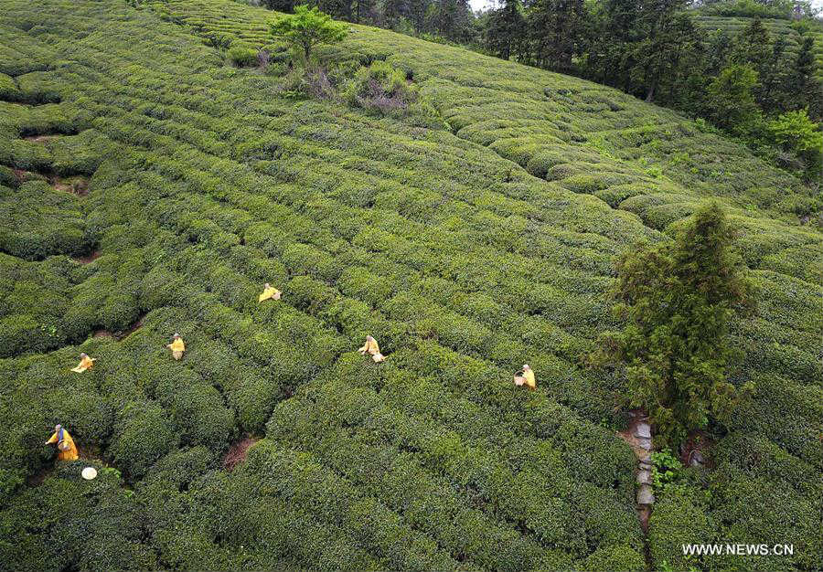 Monjas del Templo Tiantai recogen hojas de té después de la ceremonia que marca el inicio de la recolección de té en la monta?a Tiantai del condado Hong'an, provincia de Hubei, el 3 de mayo de 2017. El Templo Tiantai posee un enorme jardín de té. Los monjes de este lugar son expertos en la siembra, colecta y preparación de té. (Xinhua / Du Huanju)
