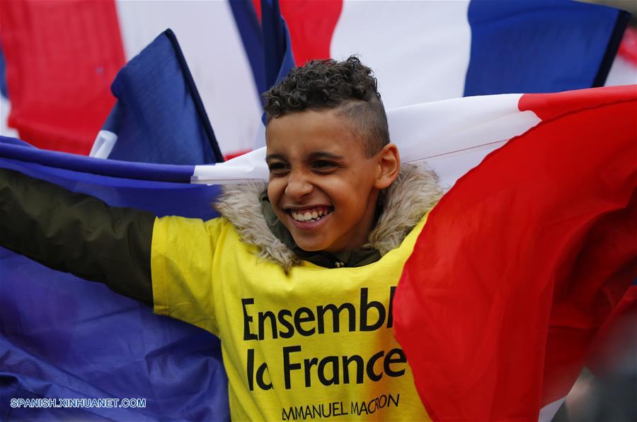PARIS, mayo 7, 2017 (Xinhua) -- Un ni?o reacciona durante un evento frente al Museo del Louvre, en París, Francia, el 7 de mayo de 2017. El candidato centrista de Francia, Emmanuel Macron, ganó la segunda vuelta de la elección presidencial francesa el domingo, al derrotar a su rival de extrema derecha Marine Le Pen, de acuerdo con las primeras proyecciones después de la votación. (Xinhua/Panoramic/ZUMAPRESS)