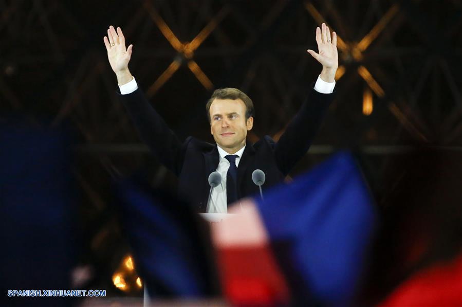 PARIS, mayo 7, 2017 (Xinhua) -- Emmanuel Macron, el candidato presidencial por el movimiento En Marcha, reacciona frente al Museo del Louvre, en París, Francia, el 7 de mayo de 2017. El candidato centrista de Francia, Emmanuel Macron, ganó la segunda vuelta de la elección presidencial francesa el domingo, al derrotar a su rival de extrema derecha Marine Le Pen, de acuerdo con las primeras proyecciones después de la votación. (Xinhua/Panoramic/ZUMAPRESS)