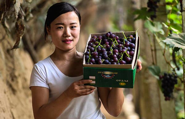 Una mujer de la provincia de Hebei sostiene una caja de uvas. [Foto: Xinhua]