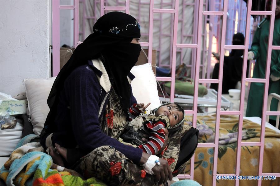 SANA, mayo 11, 2017 (Xinhua) -- Imagen del 10 de mayo de 2017 de una mujer sosteniendo a su bebé que sufre de cólera en un hospital en Saná, Yemen. El peligro de una epidemia de cólera en Yemen se ha ampliado enormemente debido a un colapso del sistema de salud pública luego de la guerra de dos a?os entre rebeldes hutíes y el Gobierno. (Xinhua/Mohammed Mohammed)