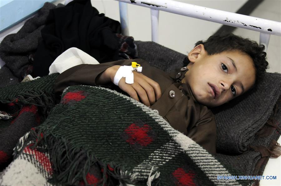 SANA, mayo 11, 2017 (Xinhua) -- Imagen del 10 de mayo de 2017 de un ni?o que sufre de cólera recibiendo tratamiento en un hospital en Saná, Yemen. El peligro de una epidemia de cólera en Yemen se ha ampliado enormemente debido a un colapso del sistema de salud pública luego de la guerra de dos a?os entre rebeldes hutíes y el Gobierno. (Xinhua/Mohammed Mohammed)