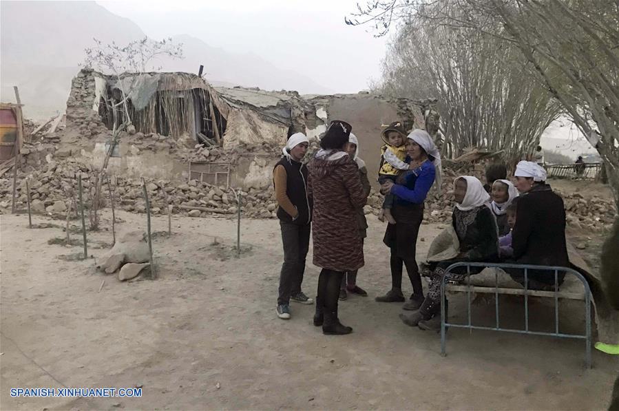 TAXKORGAN, mayo 11, 2017 (Xinhua) -- Residentes reaccionan frente a casas da?adas en la aldea Kuzigun en el condado de Taxkorgan, en la Región Autónoma Uygur de Xinjiang, en el noroeste de China, el 11 de mayo de 2017. Ocho personas murieron y 23 más resultaron heridas a causa de un terremoto de magnitud 5.5 que sacudió el jueves a las 5:58 (hora de Beijing) el distrito de Taxkorgan de la Región Autónoma Uygur de Xinjiang, en el noroeste de China, informaron fuentes locales. (Xinhua/Li Jing)